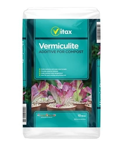 Vermiculite Additive for Compost from Vitax. Add Vermiculite to potting compost to retain moisture and aerate soil. Vermiculite is lightweight, natural, non-toxic and can be used on its own or mixed into compost. The absorbent flakes retain water and nutrients. Use in large pots where weight is a concern.
